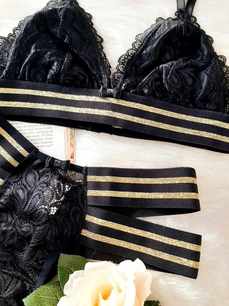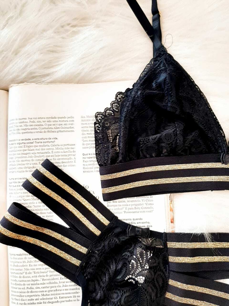 Uma calcinha de renda com as laterais em elasticos duplos com detalhes em dourado